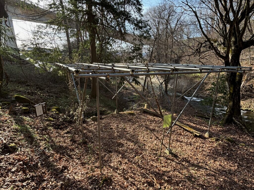 斜面を進むと案内看板にあった「ながれ橋」が見えてきます。コンクリートの土台に丸木をポンと置いただけの橋で、初見だとかなりのインパクトがある作りになっています。