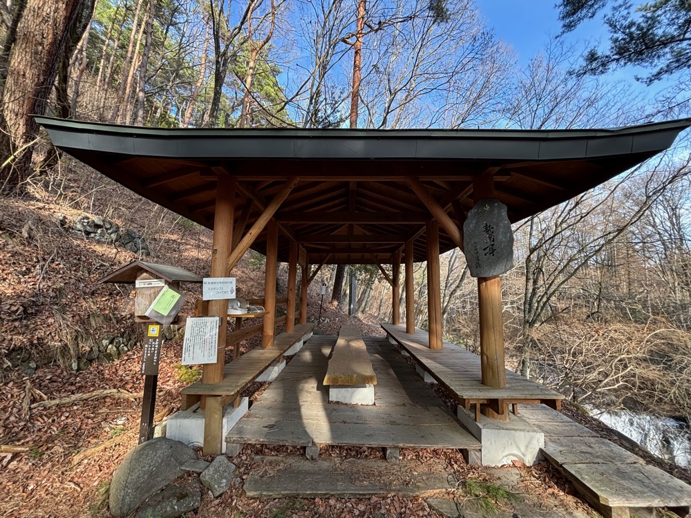 ながれ橋で多留姫の滝を見てからは柳影橋に向かわずに山の斜面を上がっていくと「載酒亭」という東屋があります。ここから多留姫の滝を見下ろすことができ、さらにはその先の上流にある堰堤まで歩いて行くこともできますので、余裕があればぜひ訪れてみてください。