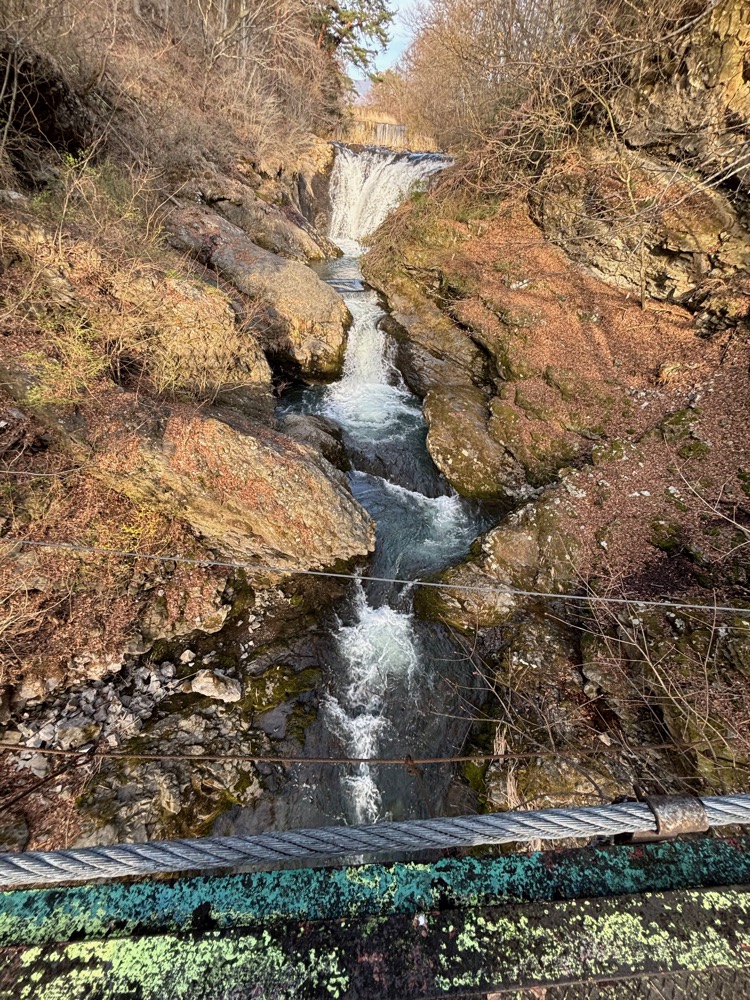 すると多留姫の滝の落ち口をきれいに見下ろせる場所がありました!足場が岩でデコボコしていてちょっと不安定ですが、ながれ橋と柳影橋を見下ろしながら滝を一望できる素晴らしい景色の出会えました。(逆光で申し訳ないです。。。)