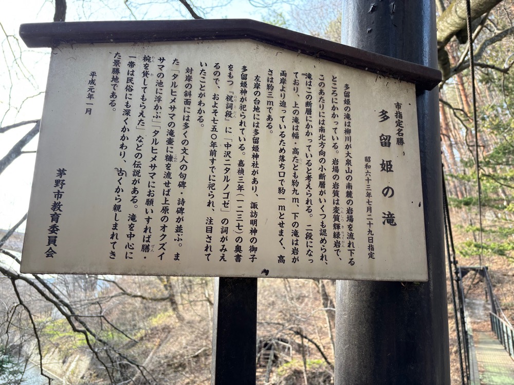上の写真は現地にある案内看板です。多留姫の滝は大泉山に広がる「多留姫文学自然の里」の中にあるとのことで、ちょっと調べてみると茅野市のHPに情報がありました。