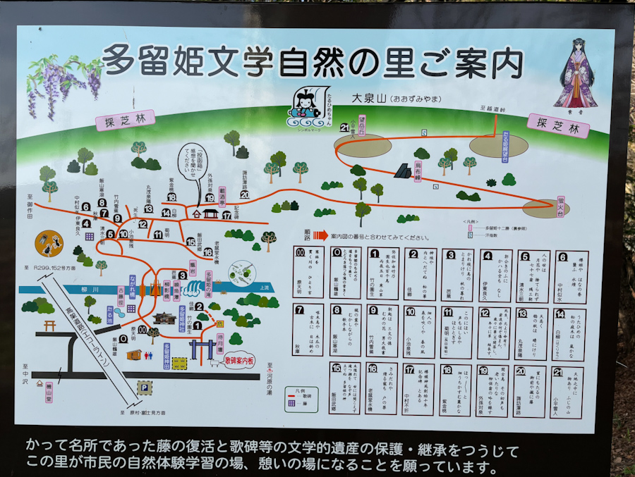 番号がある印は歌や俳句が彫られた石碑の位置を示して、たしかに現地には歌が彫られた石碑がいくつもありましたが、多留姫の滝を見たい気持ちのほうが強かったので完全にスルーしています笑