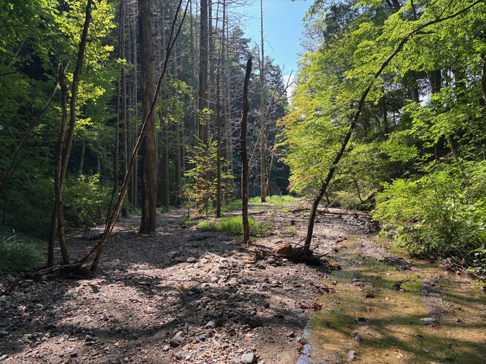 斜面を降りた先にはちょっとした小川が待ち構えてます。清音の滝にアクセスはここが一番難所で、濡れないで渡れる箇所がないので、運動に自信が無い人だと靴を脱いで渡るしかありません。あらかじめサンダルやタオルを持っていくことを強くおすすめします。