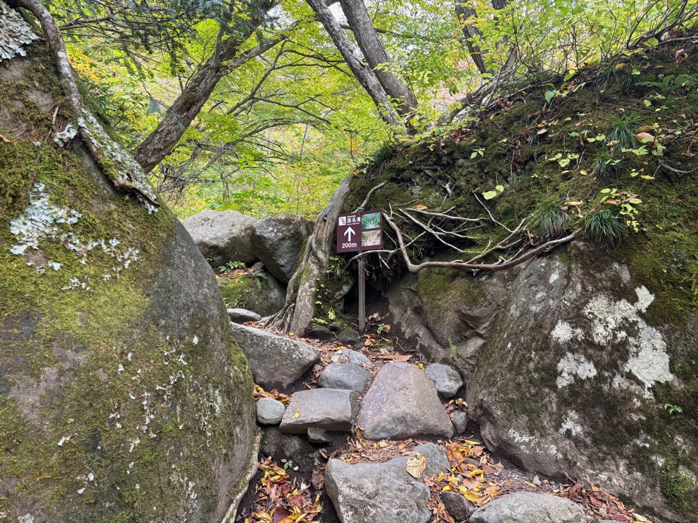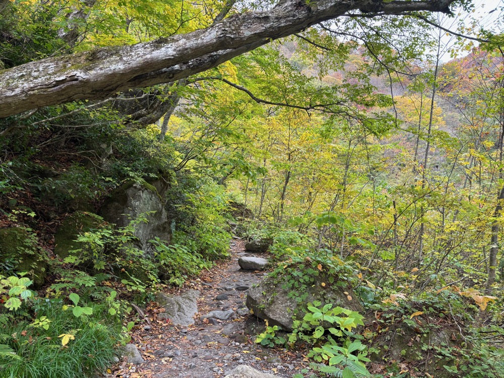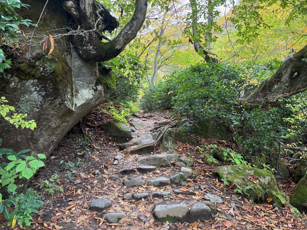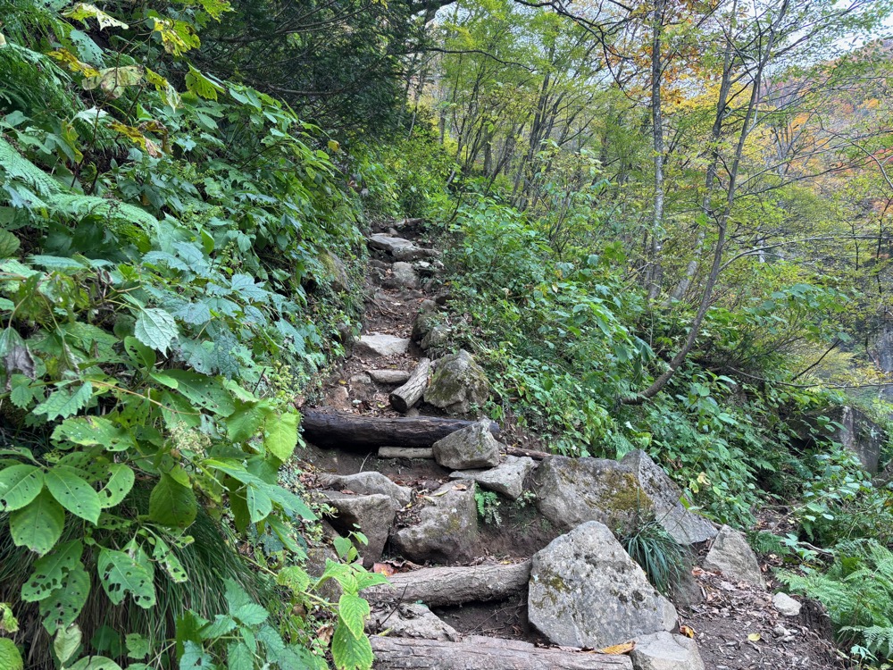 3階分ほどの階段を登って堰堤を超えると、そこから苗名滝まではちょっとした山道となります。そこそこ大きめの岩が転がっていますが、平らにならしてあるので歩きやすく、スニーカーで十分です。(ストックがなくても大丈夫でした)