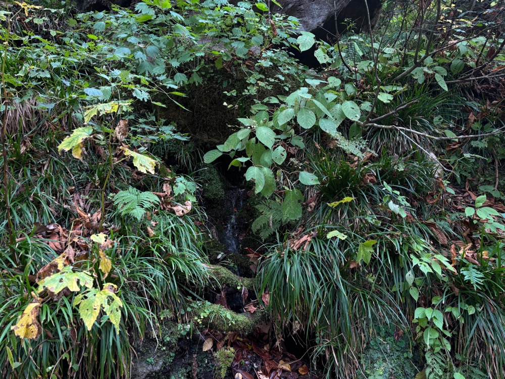 まだまだ苗名滝に近づけるので、さらに遊歩道を進んでみると途中でチロチロと湧水が流れている場所がありました。そんなに水はありませんでしたが、湧水があるだけで心が少し踊ってしまう筆者。